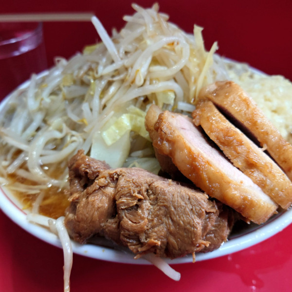 脂たっぷりでしょっぱめ、ゴワゴワ太麺の「ラーメン二郎」の本店。常に行列。無料トッピングとして「ニンニク、ヤサイ、脂、カラメ」があるので、「ニンニク入れますか?」と聞かれたらオーダーを伝える方式。